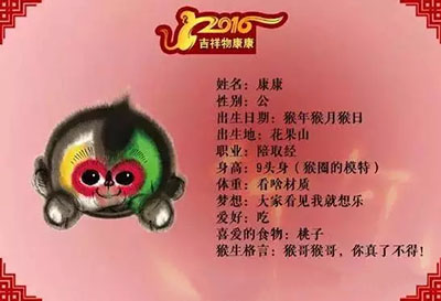 猴年春晚吉祥物"康康",由北京奧運會吉祥物"福娃"的創(chuàng)作者韓美林大師設(shè)計,以中國傳統(tǒng)水墨畫的藝術(shù)形式,表現(xiàn)"猴"的特點。這也是春晚歷史上第二任吉祥物。