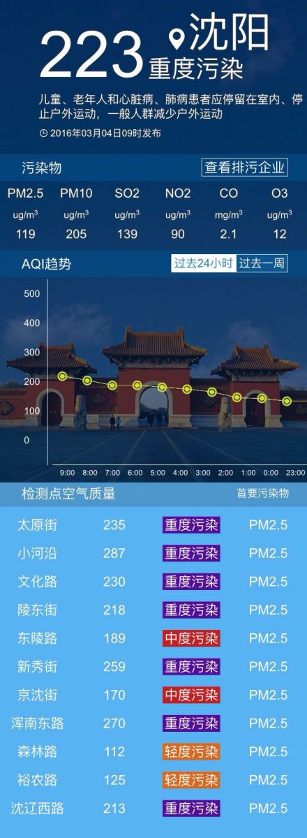 接下來共同關(guān)注沈陽(yáng)未來幾天的具體天氣:今天是多云轉(zhuǎn)小雨天氣,空氣質(zhì)量重度污染,西南風(fēng)微風(fēng),最高氣溫12℃,最低氣溫2℃。