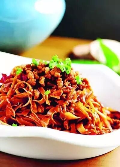 這是根據(jù)川菜演變而來的菜品,與麻婆豆腐比,這道菜口味更重。在炒制時(shí),除了加入豆瓣醬,還加入刀口辣椒,使菜品口味更辣。
