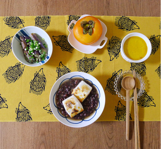紅豆沙配日式烤年糕,味增燒茄子,柿子和南瓜布丁