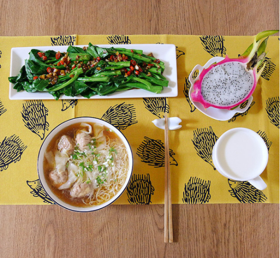 云吞面,白灼芥藍(lán),火龍果和牛奶