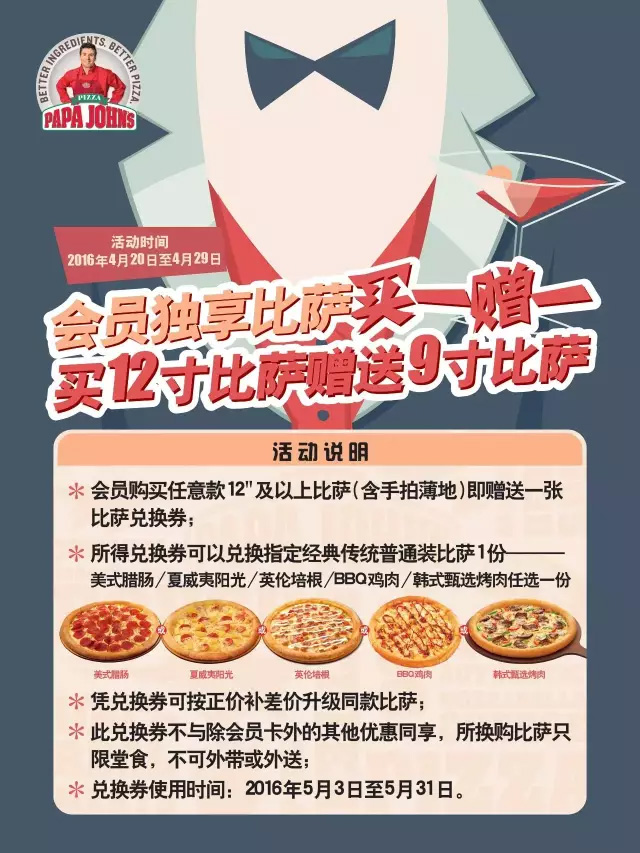 會員顧客們在4月20日至4月29日購買12寸及以上尺寸的比薩,即可獲得一份9寸比薩(普通卷邊)的兌換券,該券可在下一次進(jìn)店消費(fèi)的時候進(jìn)行使用,兩店通用。