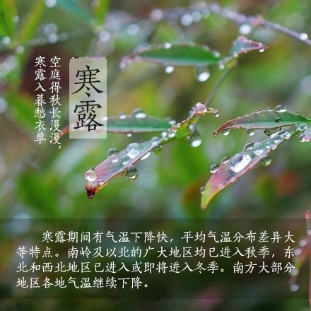 露氣寒冷,深秋節(jié)令,沈陽最低氣溫已經跌到零度,看來冬天真的離我們不遠了;北方呈深秋景象,白云紅葉,偶見早霜;