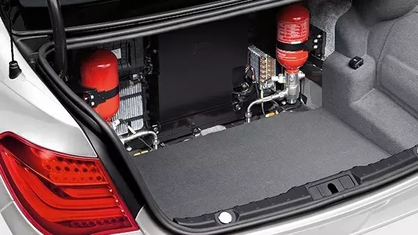 除此之外,BMW 7系防彈車的后備箱內(nèi)還配備了自動滅火系統(tǒng)、氧氣瓶和兩組獨立供電系統(tǒng),當(dāng)發(fā)動機或車底起火時溫度傳感器會立即啟動自動滅火系統(tǒng)。