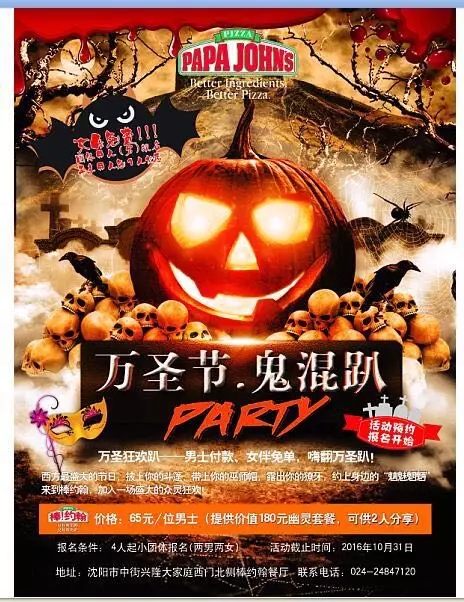 棒約翰的廚房設(shè)備是由沈陽東方和利廚業(yè)有限公司提供的。萬圣節(jié)想好組織什么活動了嗎?快快組成小團(tuán)體預(yù)約報名吧!聽說手慢了,就沒位置啦!
