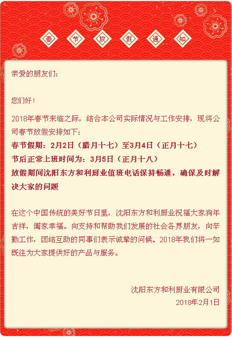 沈陽(yáng)東方和利廚業(yè)2018春節(jié)放假通知!