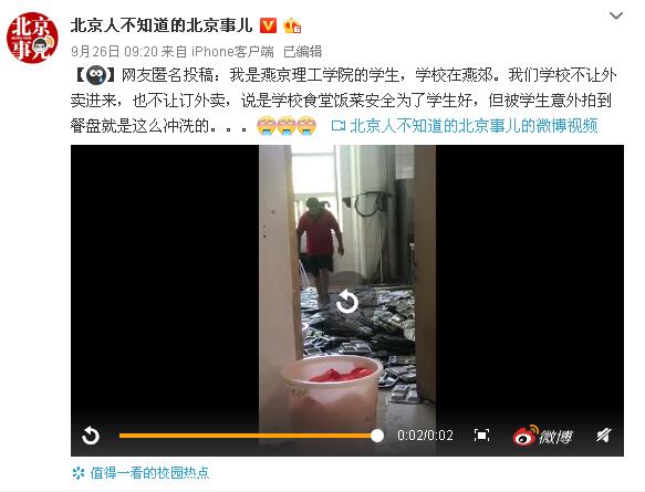 據(jù)河北燕京理工學(xué)院的學(xué)生爆料稱:"我們學(xué)校不讓外賣進(jìn)來,也不讓訂外賣,說是學(xué)校食堂飯菜安全,為了學(xué)生好,但被學(xué)生意外拍到餐盤就是這么沖洗的。"