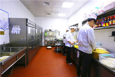 廚房的燈光:餐廳的燈光重文化,廚房的燈光重實(shí)用。這里的實(shí)用,主要指臨爐炒菜要有足夠的燈光以把握菜肴色澤;案板切配要有明亮的燈光,以有效防止刀傷和追求精細(xì)的刀工;出菜打荷的上方要有充足的燈光,切實(shí)減少雜草混入并流入餐廳等等。廚房燈光不一定要像餐廳一樣豪華典雅、布局整齊,但其作用絕不可忽視。