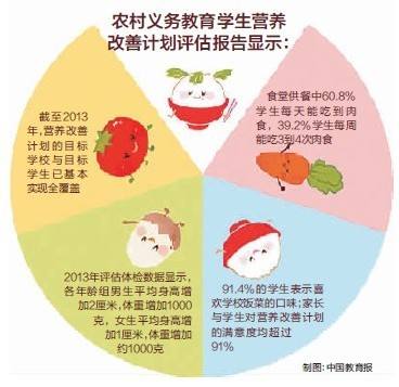 自該《意見》頒發(fā)以來我國(guó)積極在全國(guó)范圍內(nèi)實(shí)施農(nóng)村義務(wù)教育學(xué)生營(yíng)養(yǎng)餐試點(diǎn)學(xué)校項(xiàng)目,為學(xué)校增添了蒸飯車、電熱灶、消毒柜等食堂設(shè)施設(shè)備,給各實(shí)施學(xué)校配備牛奶加熱箱、滅蠅燈、溫度濕度計(jì)、消毒燈、保鮮柜等,配齊食堂設(shè)施設(shè)備。目前農(nóng)村義務(wù)教育學(xué)生營(yíng)養(yǎng)改善計(jì)劃已覆蓋所有國(guó)家級(jí)貧困縣,全國(guó)已有上千所農(nóng)村貧困學(xué)校,能夠?yàn)閷W(xué)生供應(yīng)熱食正餐,讓3700萬名農(nóng)村學(xué)生受益,營(yíng)養(yǎng)健康狀況得到顯著改善 。