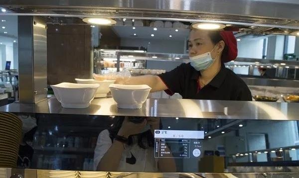 菜品的名稱、價(jià)格、重量及營(yíng)養(yǎng)成分都可以通過看"營(yíng)養(yǎng)價(jià)簽屏"來了解。不僅顏值在線,備餐臺(tái)的"智商"也不低。工作人員把餐具放在出品終端上輕輕一掃,滴的一聲菜品信息就被錄入了。