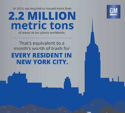 2013年,通用汽車的全球工廠回收再利用的廢棄物材料總量超過(guò)220萬(wàn)噸。這些廢棄物能裝滿3800萬(wàn)個(gè)完整的垃圾袋,而且它相當(dāng)于每個(gè)紐約居民在一個(gè)月產(chǎn)出的垃圾總和。