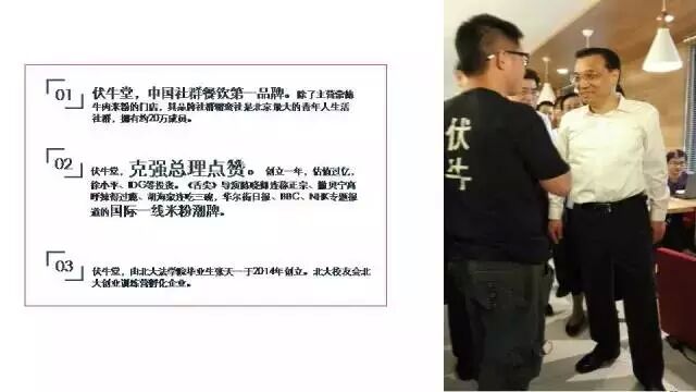 上邊這張圖片是2015年5月份克強(qiáng)總理來中關(guān)村訪問時的場景,當(dāng)時總理主要接見了三家公司的負(fù)責(zé)人,一家是聯(lián)想集團(tuán),一家是3W咖啡,還有一家就是伏牛堂了。