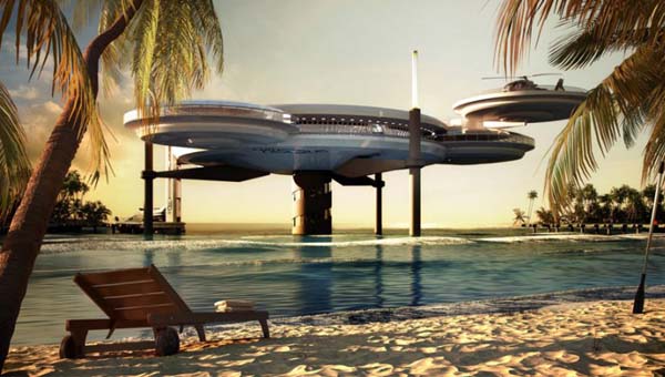 水鐵餅酒店是兩個圓盤狀結構組成,一個位于水面之上,一個位于水面之下,它們通過三個"支架"連接在一起,這個支架結構內(nèi)設有電梯和樓梯,便于顧客在水下和水上酒店部分穿行。