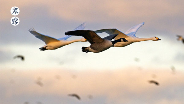 寒露分三候。一候,鴻雁來(lái)賓,時(shí)至寒露,鴻雁南遷。有種說(shuō)法是賓同"濱",是水邊的意思,鴻雁都飛往江南水濱。