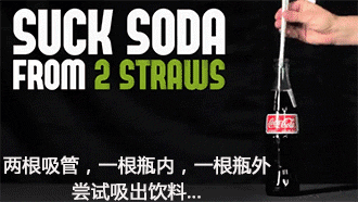 兩根吸管,一根瓶內(nèi),一根瓶外嘗試吸出飲料