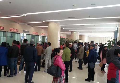 繳費(fèi)現(xiàn)場(chǎng)在等待交費(fèi)的市民很多,由于繳費(fèi)大廳已經(jīng)人滿為患,不少人只能在室外等待。