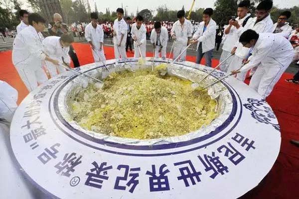 據(jù)了解,2015年是揚州建城2500周年,世界中國烹飪聯(lián)合會、揚州市旅游局、揚州市烹飪協(xié)會等單位舉辦了創(chuàng)"最大份炒飯"、刷新吉尼斯世界紀錄活動。此前,刷新此項紀錄的是土耳其,2014年9月認證的總重量是3150公斤。