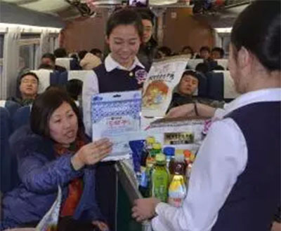 火車上:啤酒、飲料、礦泉水了啊,面包、香腸、烤魚片了啊,來,腳讓一下!