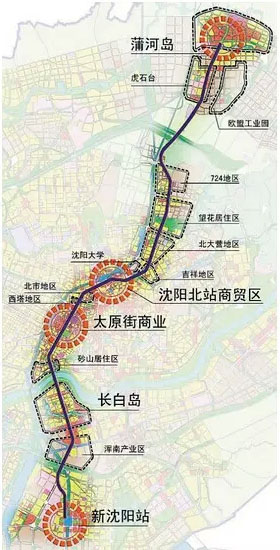 沿線貫穿了沈陽(yáng)北站、沈陽(yáng)南站等重要公共交通樞紐,沈陽(yáng)北站片區(qū)、太原街等金融商貿(mào)區(qū),砂山、望花、虎石臺(tái)、蒲河島等居住區(qū),以及沈陽(yáng)大學(xué)、渾南產(chǎn)業(yè)區(qū)、歐盟工業(yè)區(qū)等科教、產(chǎn)業(yè)區(qū)。