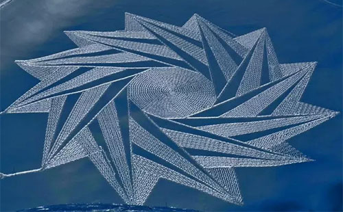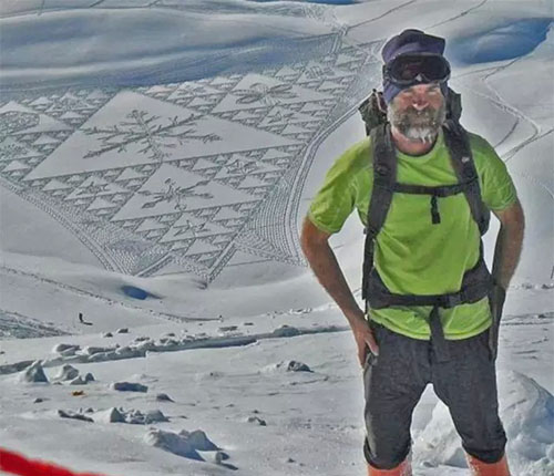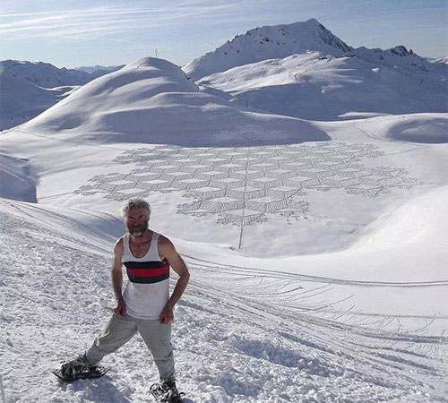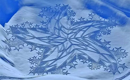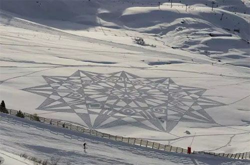 2004年,Simon Beck在雪地里滑了一天雪后心血來潮,突然在地上走出了一顆星星的形狀,到了滑雪場(chǎng)旅館樓上往下一看,他被自己的杰作帥倒了!