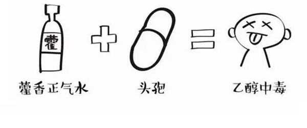 藿香正氣水中含有酒精,在體內(nèi)消化產(chǎn)生乙醇,而頭孢類藥物會抑制乙醇在體內(nèi)的代謝,造成乙醇蓄積,引起中毒,嚴(yán)重時可誘發(fā)急性肝損害、呼吸暫停甚至死亡。
