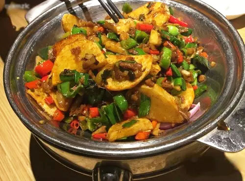 想吃辣去這家絕對是很好的選擇。但他家最辣的居然不是辣子雞啊什么的,是看似很簡單的干鍋土豆片。里面全是青紅兩色的辣椒,越加熱越辣,越吃越辣,大瓶可樂自己一人就能喝一瓶!