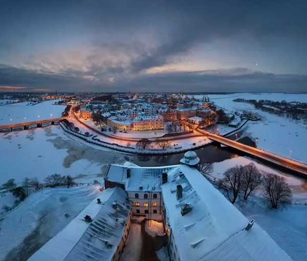 俄羅斯維堡坐落于俄羅斯和芬蘭的交界處,并且被塞馬運(yùn)河環(huán)繞著,運(yùn)河到冬天時(shí)會(huì)結(jié)冰,在城堡的塔上向下俯瞰,整個(gè)小鎮(zhèn)看起來完全被積雪所覆蓋,非常美麗。