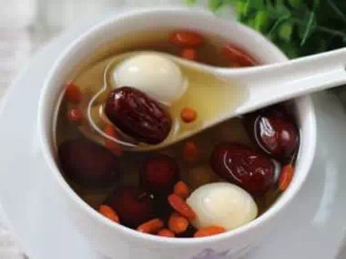 紅棗加桂圓煲紅糖水,到棗爛、桂圓綿時,打只雞蛋;繼續(xù)用小火焐熟雞蛋。紅棗、桂圓和紅糖都有補血的功效,煮出的雞蛋很滋補。